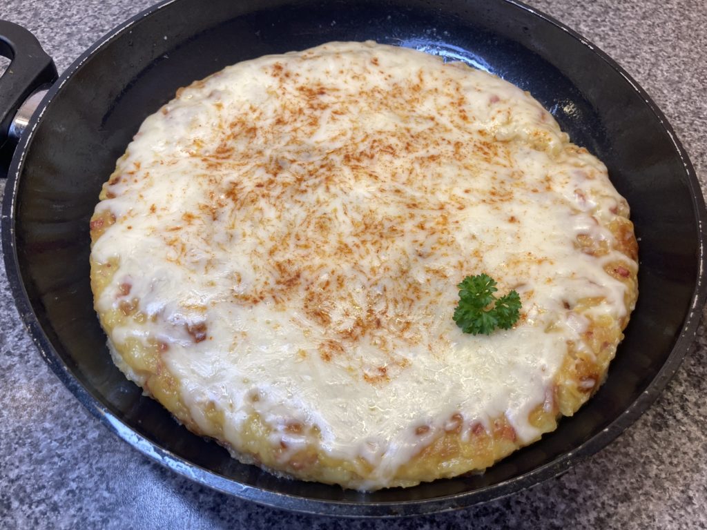 5. Wenn das Brot angebraten ist, wird die Eiermasse einfach komplett über das Brot gegeben